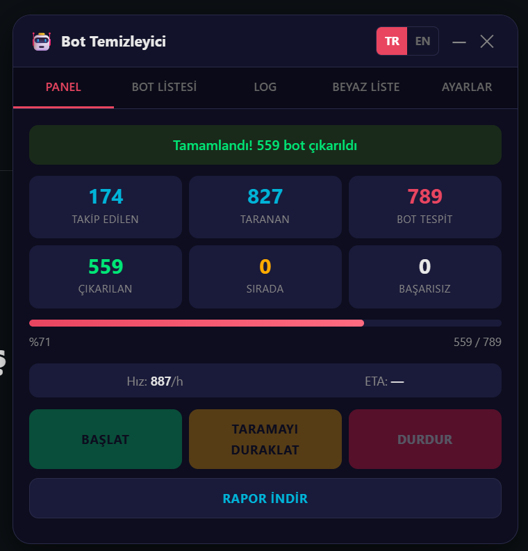 - Detaylı JSON rapor indirme: takip sayısı, taranan sayısı, bulunan botlar, kaldırılanlar (zaman damgalı), başarısızlar (hata kodlu), kalan kuyruk